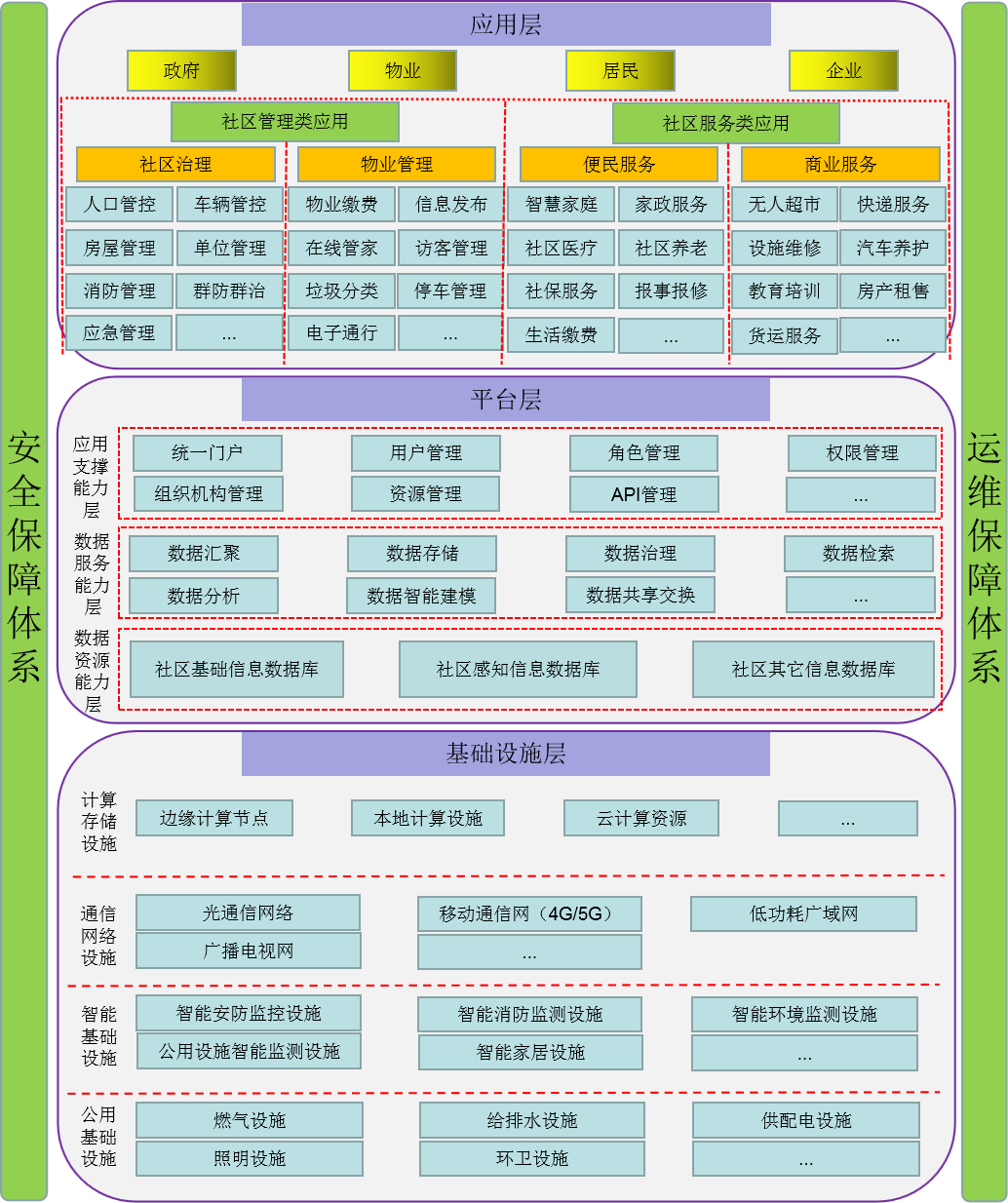 主要指構(gòu)建智慧社區(qū)基礎運行環(huán)境、面向社區(qū)信息化建設的系列軟硬件設施,包括社區(qū)市政公用設施、網(wǎng)絡通信設施、智能基礎設施及計算存儲設施等。