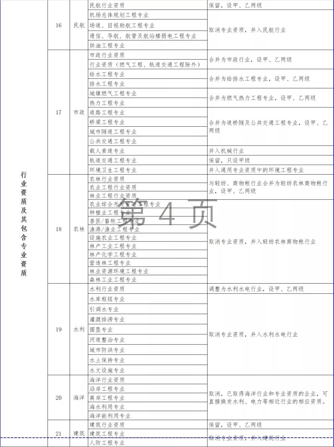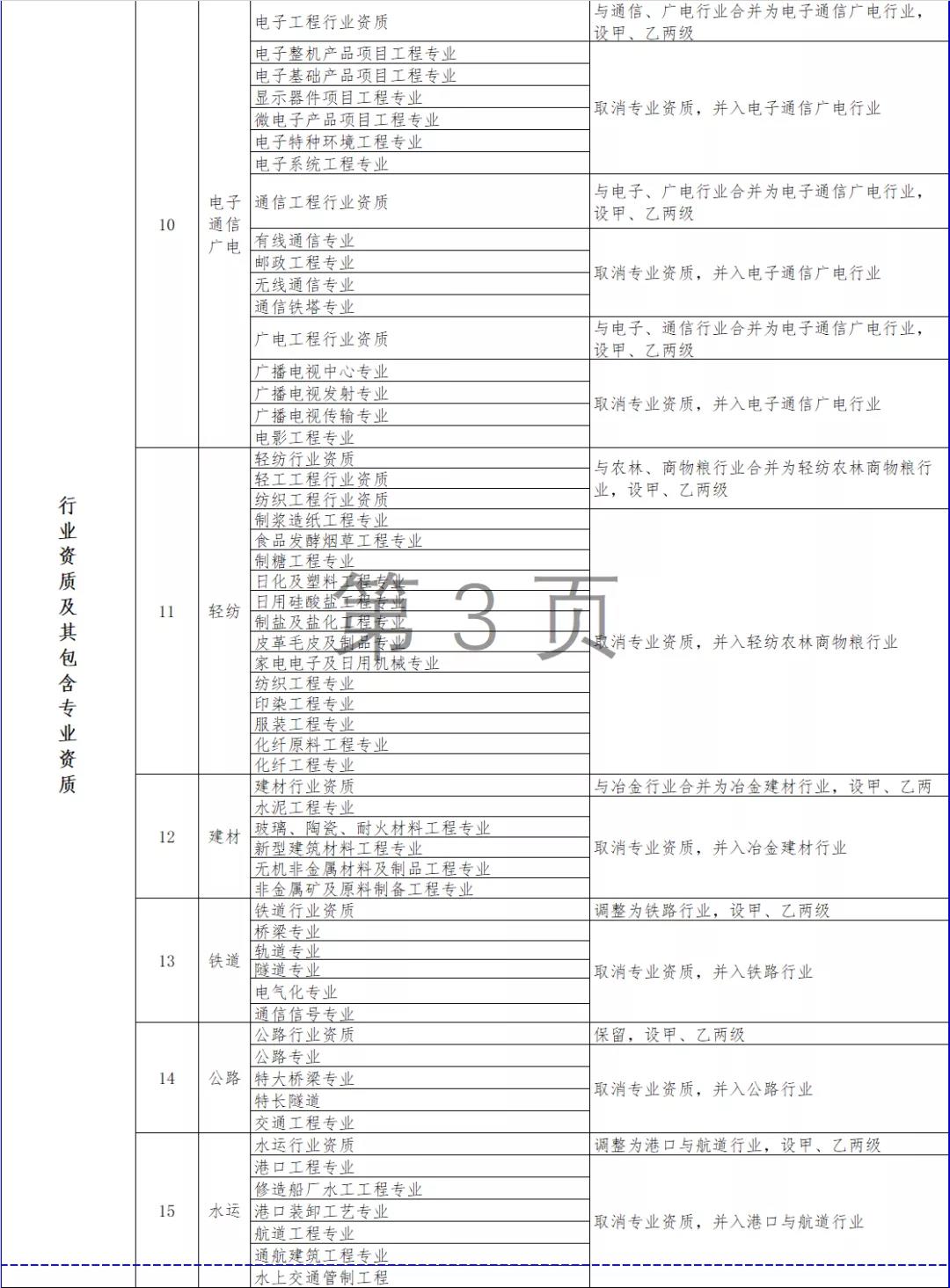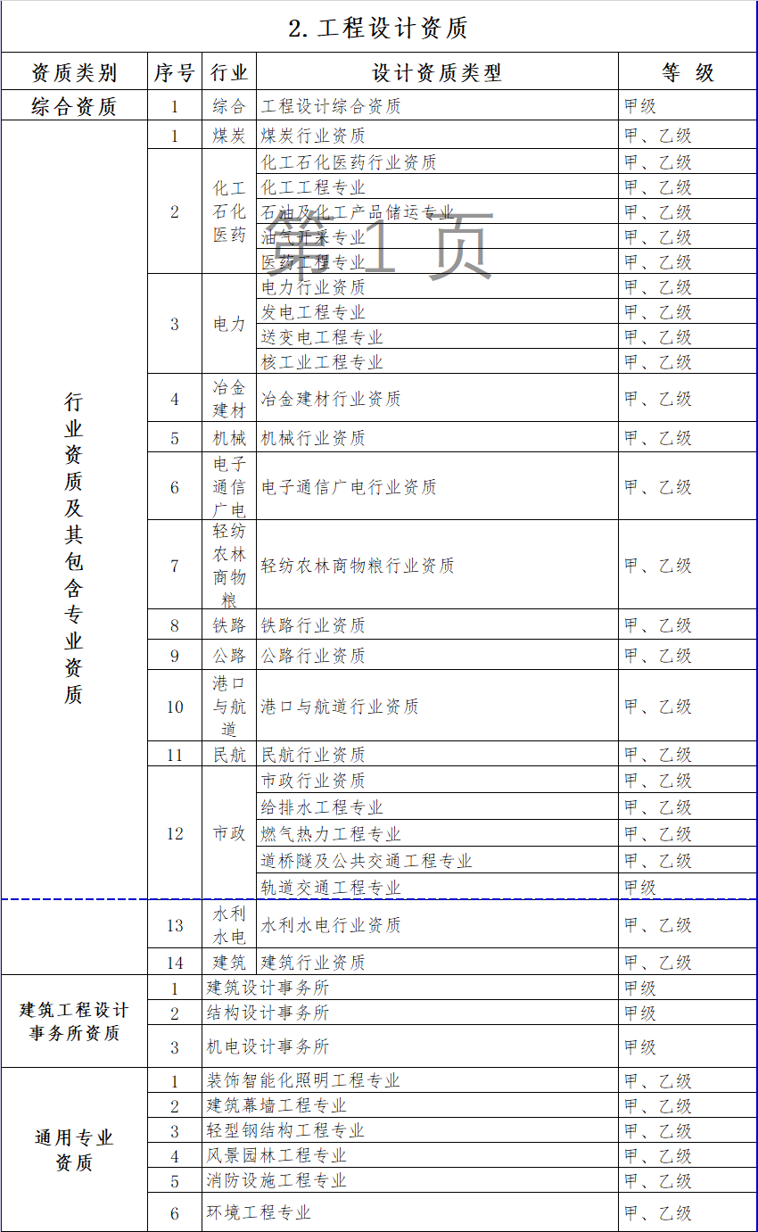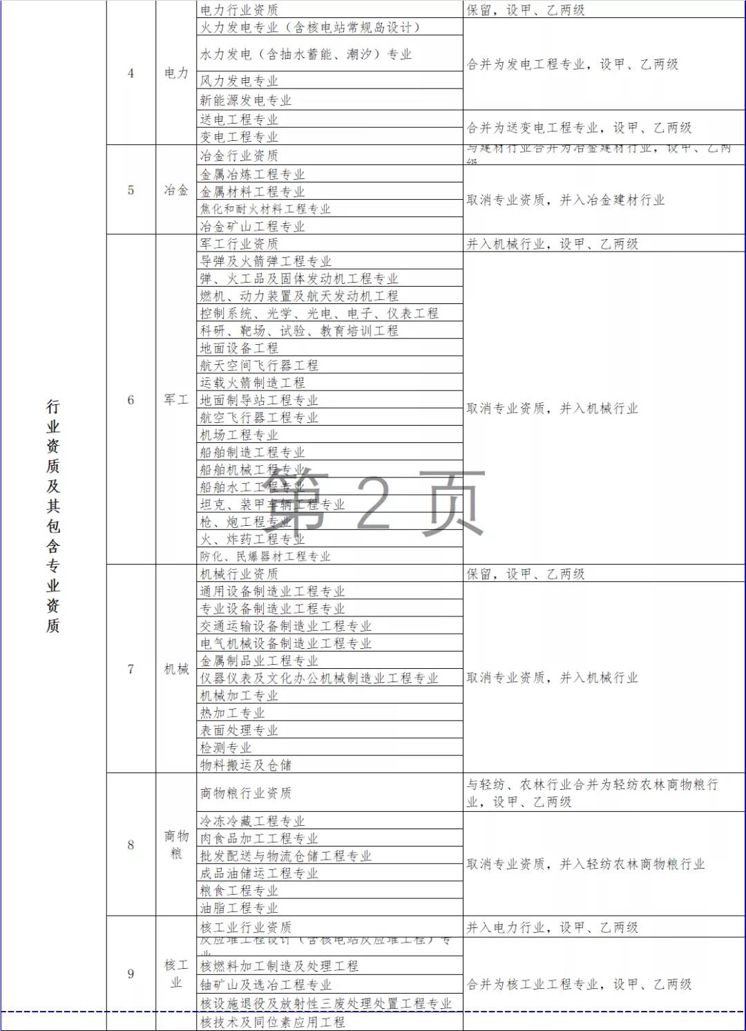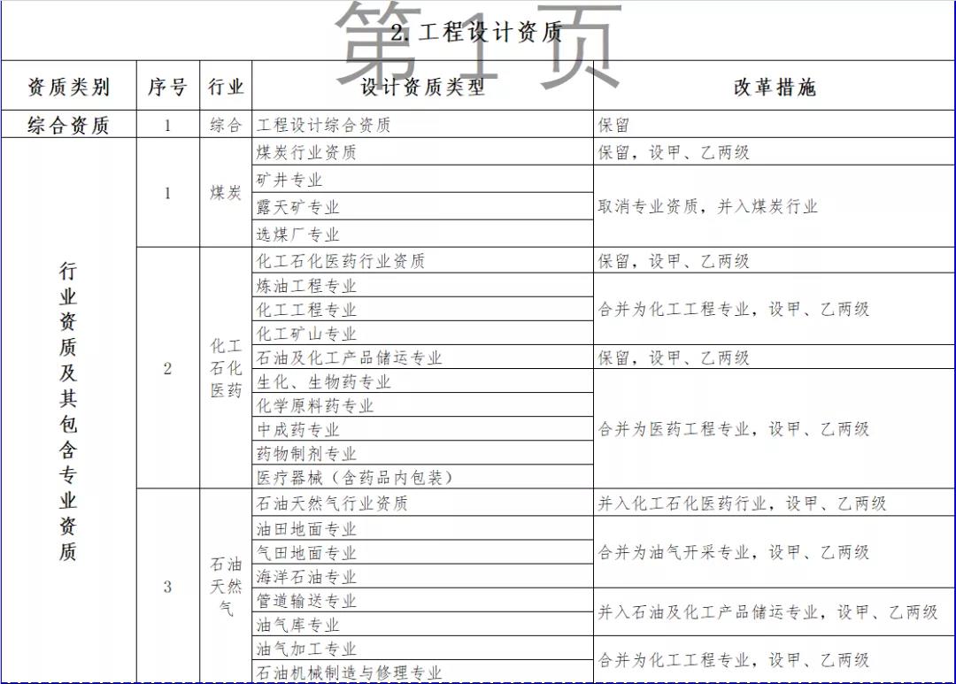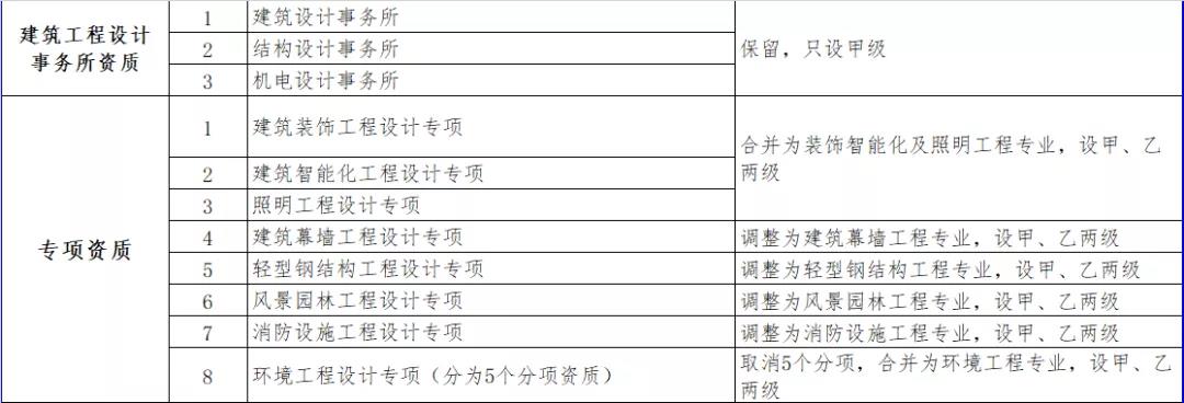(二)工程設(shè)計資質(zhì)。保留綜合資質(zhì)。對部分行業(yè)資質(zhì)進(jìn)行整合,其中,冶金行業(yè)與建材行業(yè)合并為冶金建材行業(yè)資質(zhì),輕紡行業(yè)、農(nóng)林行業(yè)、商物糧行業(yè)合并為輕紡農(nóng)林商物糧行業(yè),電子行業(yè)、通信行業(yè)、廣電行業(yè)合并為電子通信廣電行業(yè),石油天然氣行業(yè)并入化工石化醫(yī)藥行業(yè),軍工行業(yè)并入機械行業(yè),核工業(yè)行業(yè)并入電力行業(yè),資質(zhì)等級壓減為甲、乙兩級,原丙級資質(zhì)并入相應(yīng)行業(yè)乙級資質(zhì)。取消海洋行業(yè)及專業(yè)資質(zhì),相關(guān)企業(yè)可以換發(fā)相近行業(yè)資質(zhì)。整合原化工石化醫(yī)藥、石油天然氣、電力、市政行業(yè)中的專業(yè)資質(zhì),資質(zhì)等級壓減為甲、乙兩級,原丙級資質(zhì)并入相應(yīng)專業(yè)乙級資質(zhì);取消其他行業(yè)的專業(yè)資質(zhì),并入相應(yīng)行業(yè)資質(zhì),原甲、乙級專業(yè)資質(zhì)并入相應(yīng)等級的行業(yè)資質(zhì),原丙級專業(yè)資質(zhì)并入乙級行業(yè)資質(zhì)。將專項資質(zhì)調(diào)整為通用專業(yè)資質(zhì),取消環(huán)境工程專項資質(zhì)的5個專項類別,整合為環(huán)境工程專業(yè)資質(zhì),資質(zhì)等級壓減為甲、乙兩級,原丙級資質(zhì)并入相應(yīng)專業(yè)乙級資質(zhì)。保留3類事務(wù)所資質(zhì)。