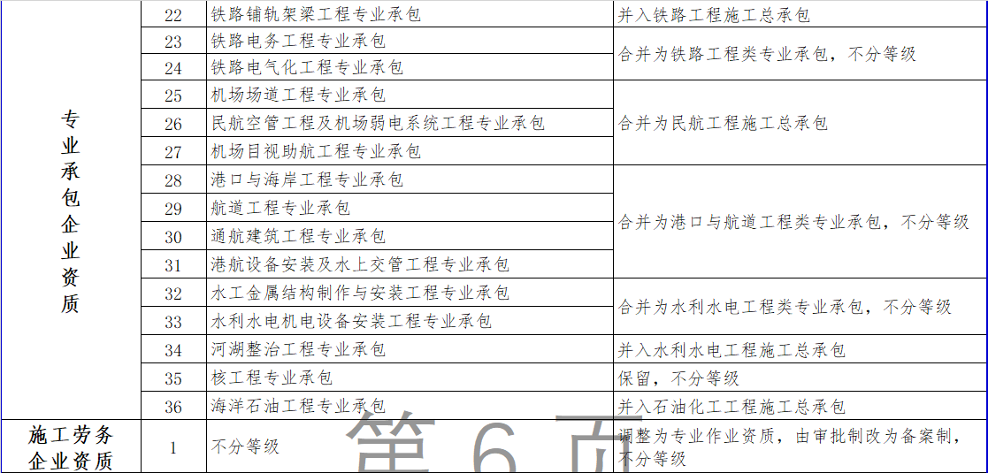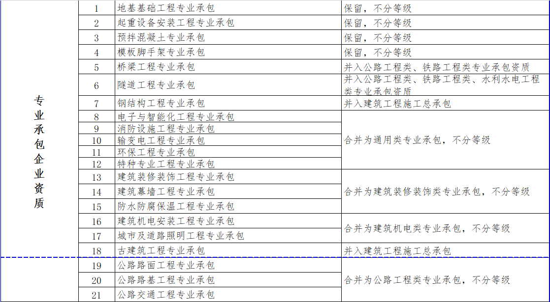 保留地基基礎(chǔ)工程、起重設(shè)備安裝工程、核工程等專業(yè)承包資質(zhì);將原專業(yè)承包資質(zhì)整合為建筑裝修裝飾類、建筑機電類、公路工程類、港口與航道工程類、鐵路工程類、水利水電工程類、通用類專業(yè)承包資質(zhì);專業(yè)承包資質(zhì)不分等級。