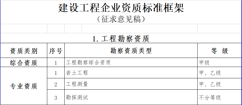 (一)工程勘察資質(zhì)。保留綜合資質(zhì)。將4類專業(yè)資質(zhì)及勘察勞務(wù)資質(zhì)整合為巖土工程、工程測量、勘探測試等3類專業(yè)資質(zhì)。專業(yè)資質(zhì)等級壓減為甲、乙兩級(勘探測試專業(yè)資質(zhì)不分等級),原丙級資質(zhì)并入相應(yīng)專業(yè)乙級資質(zhì)。